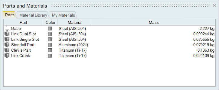 可以通过“材料”工具打开“零件和材料”列表,用于创建、导入和管理材料。