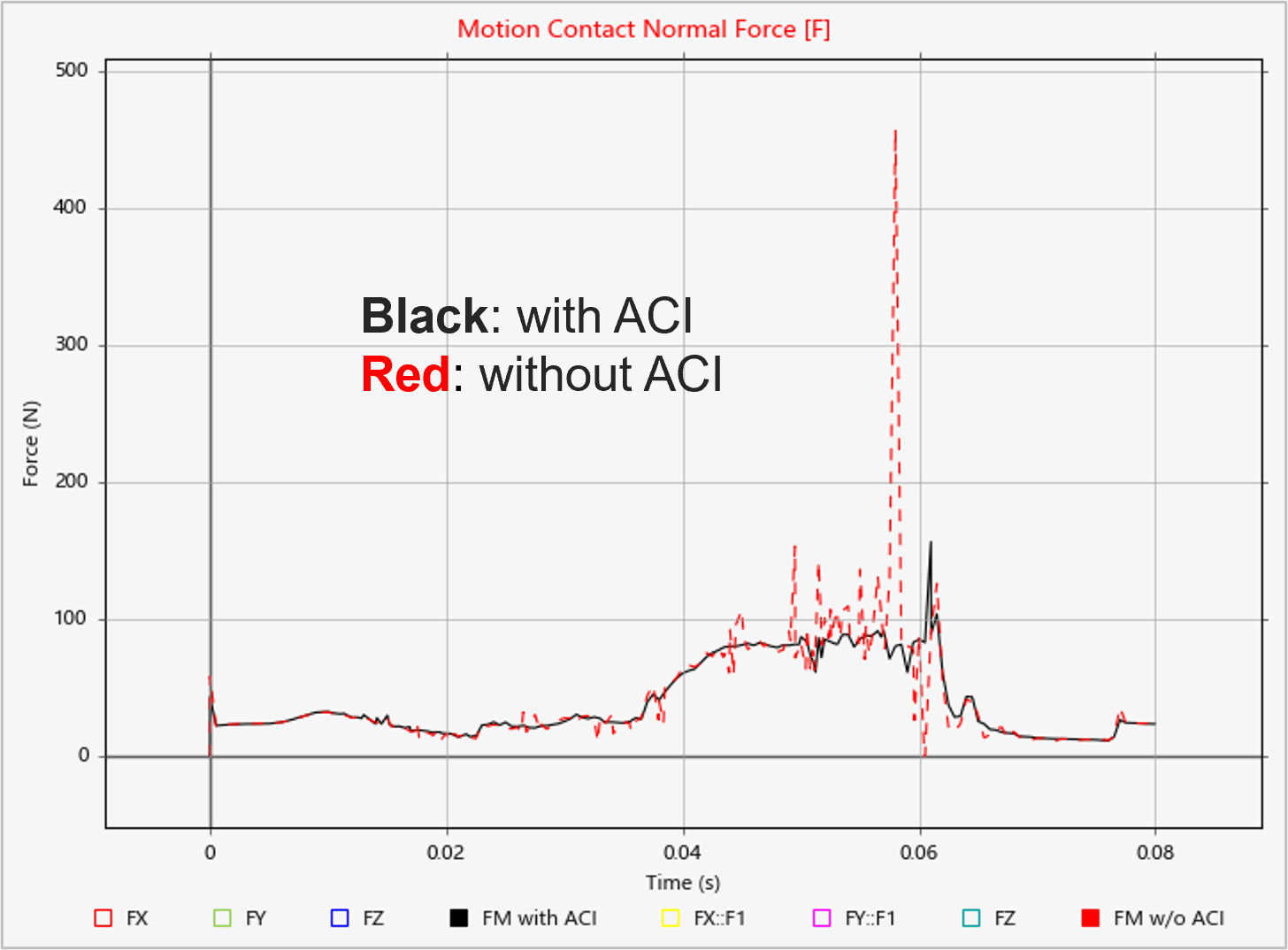 打开 ACI 可随着每个输出步骤更新雅可比矩阵,从而帮助求解收敛,得到更平滑的结果。ACI 对接触事件的解决方案进行了额外改进,有助于减少因接触力引起的噪音,并在整体上提供更准确的力结果。