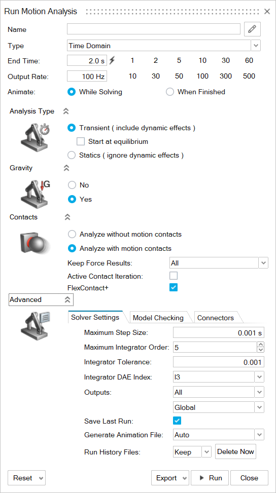 您可以控制运动仿真的运行时间、结果输出的帧数量、分析类型以及是否包含重力。