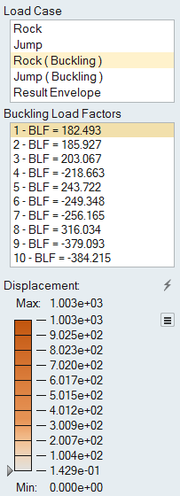 - 选择屈曲载荷系数。所选模式下的位移显示在模型视窗中。如果该模式下的值显示在模型视窗中。如果该模式的值介于 1 和 0 之间,预计零件会屈曲。如果值介于 0 和 -1 之间,零件会在相反的方向上屈曲。