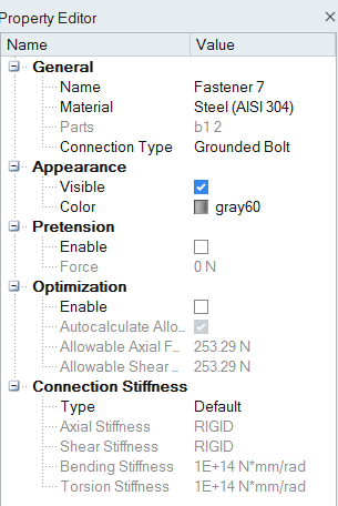 选择其中一个接地螺栓(带螺母)并检验“属性编辑器”中的“连接刚度”字段。