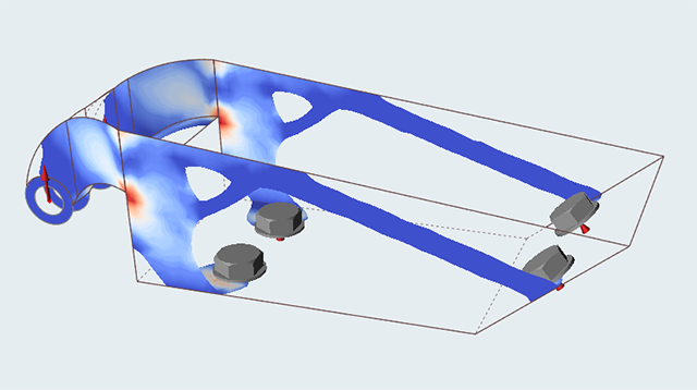 这是平动电机支架可用设计空间的一个曲面模型。注意:所有零件的指定厚度均为 2 mm,设计空间有一个对称平面,载荷已施加,并已使用接地螺栓(带螺母)对零件进行约束。