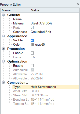 在“属性编辑器”中,将连接刚度类型更改为 Huth-Schwarmann。