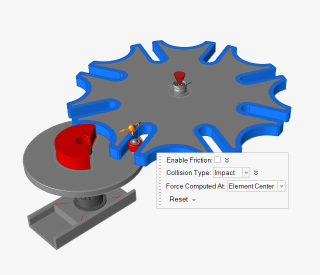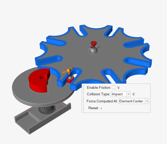 点击“分析运动”工具上的快速运行按钮,以查看运动中的模型。让模型运行完成,但不要退出复查模式。此时,零件将不穿过彼此,您也会看到 3D 接触行为。