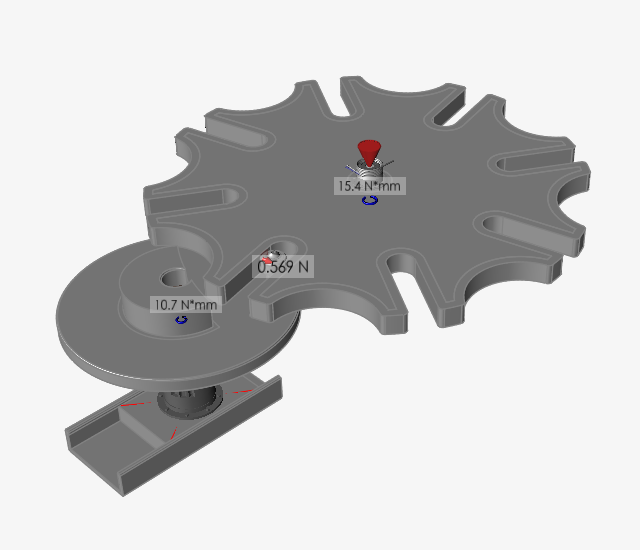 按动画工具栏上的播放按钮。当槽轮围绕其轴转动时,请注意转动电机和扭力弹簧中的接触力和扭矩如何变化。