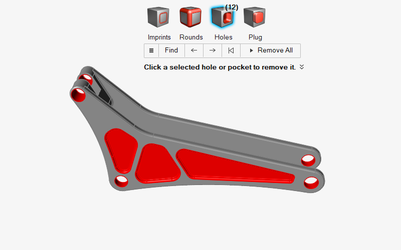 Inspire 会自动查找模型中所有的孔和凹处,并使其显示为红色。显示在“孔”图标上方的数字代表查找到的孔和凹处的总数目,在本例中是 12。