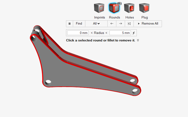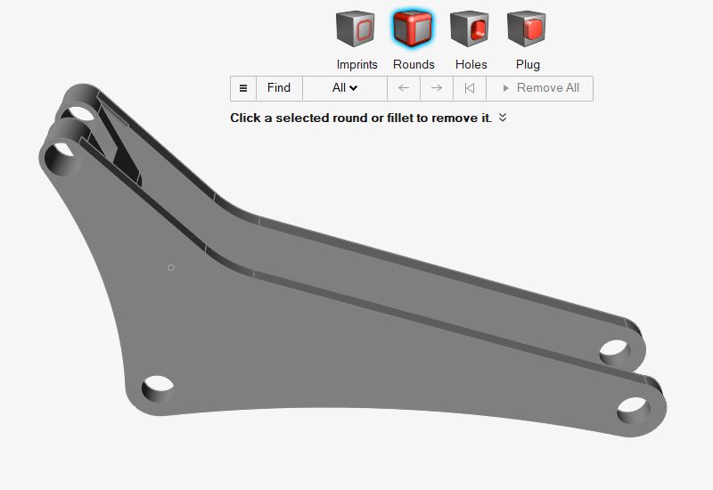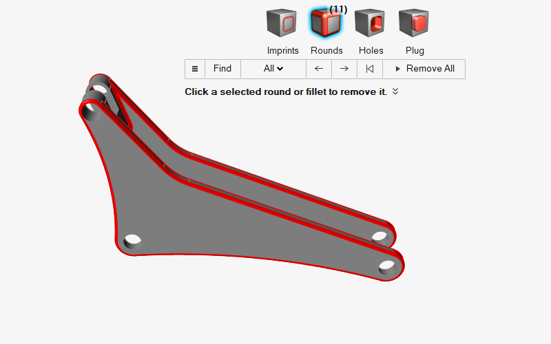 Inspire 会自动查找模型中所有的圆角和倒角。显示在“圆角”图标上方的数字表示已找到的倒角串(而不是单个倒角)的数目。注: 在可能的情况下,倒角应成串删除,而不是单个删除。