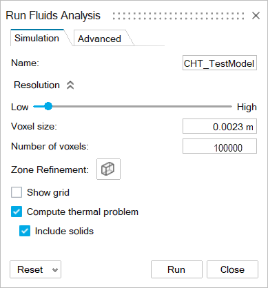 - 在仿真选项卡中,将体素数量设置为 100,000,将体素尺寸设置为 .0023 m