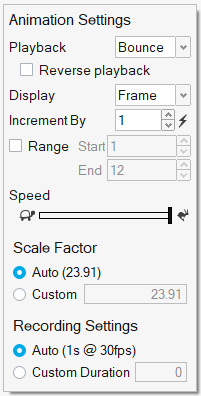 注: 动画工具栏有带自动重复功能的“上一步”和“下一步”按钮,按住其中一个按钮即可在动画中一帧一帧移动。此外,“动画设置”包括反向回放选项。