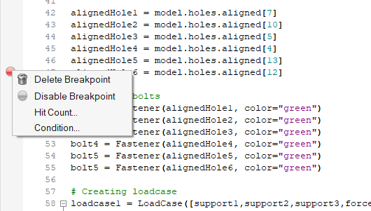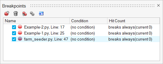 注: 必须先保存编辑器中的 Python 脚本。未保存的文件名将附加 *。激活调试模式后,调试菜单下的其他窗口将变为可用。 - 点击所需行旁边的左侧空白即可设置断点。