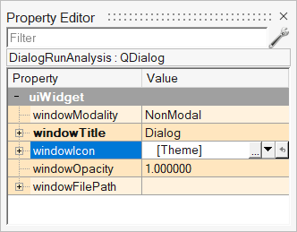 - 在属性编辑器中,选择 [widget]Title 字段,然后输入所需名称。顶层对话框仅可在对象检查器中重命名。