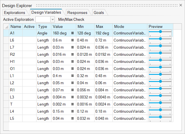 要 则 打开所有激活变量的设计变量边界检查器 点击最小/最大检查按钮。 然后点击各行中的“检查”按钮,确保最小值和最大值的组合可以产生有效模型。