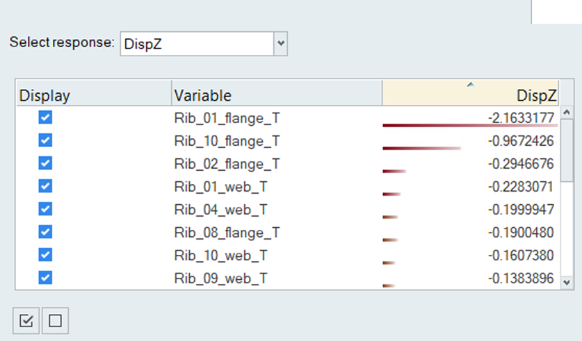 结果浏览器中的线性图显示了设计变量对选定响应的模型的相对影响。数字越大,相对于其他变量,给定变量的影响就越大。效果的颜色表示给定效果是正面的还是负面的。正面效果以蓝色阴影显示,表示设计变量的正面变化会导致响应的正面变化。负面效果以棕色阴影显示,表示设计变量的正面变化会导致响应的负面变化。例如,相对于所有其他变量,Rib_01_flange 厚度变量的增加预计会导致 Z 位移响应的显著下降。
