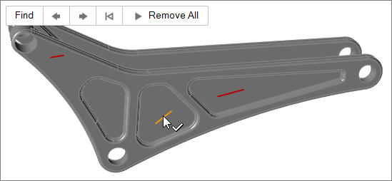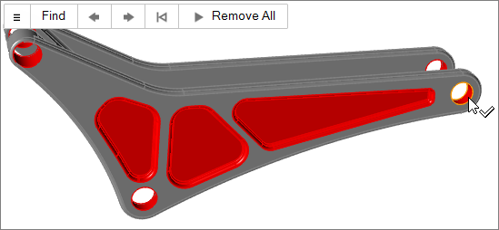 提示: 要查找并打开工具,按 Ctrl+F。更多信息请见查找和搜索工具。默认情况下,模型中的所有孔和凹处都会被选和中且高亮显示为红色。发现的孔/凹处的总数将显示在填塞工具的上方。 - 在当前显示工具的右下角选择