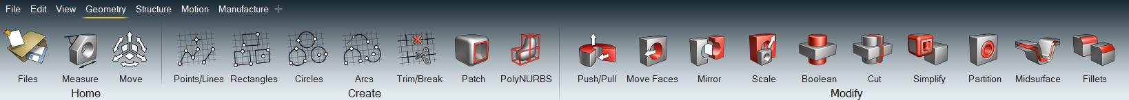 功能区 功能区位于 Inspire 工作区的顶部,方便用户快速打开各种工具和基本功能。 使用文件、编辑和视图选项卡可以打开包含标准功能的菜单(如,“撤消”和“重做”;以及“剪切”、“复制”和“粘贴”)。 使用几何、结构仿真和其他选项卡可以打开图标组中的工具。利用图标可以打开多个不同工具,将鼠标悬停在图标上可以显示其他卫星图标。 注: 还可以建立一个自定义功能区用来放置常用工具。