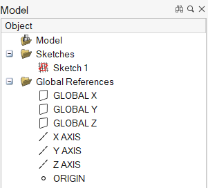 注: 模型视窗中的全局参考默认隐藏,但点击模型浏览器中的平面 、坐标轴 或原点 图标可将其设置为可见。