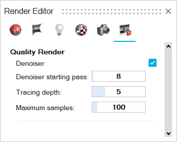 定义质量渲染设置,包括降噪器、跟踪深度和最大样本。
