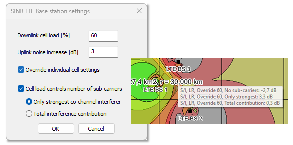 Figure 9. The SINR LTE Base station settings dialog where you can select the strongest co-channel interference only, or all interference, in addition to defining the cell load.
