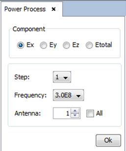 In this panel, the user can configure the component to be shown, the step, the frequency and the antenna to show the results for. Pressing the OK button will show the chart.