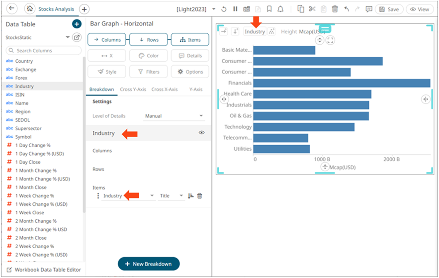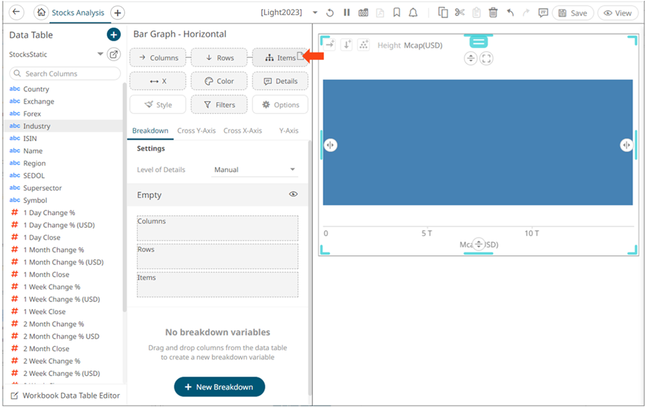 To add items to the breakdown, drag text columns from the Data Table pane to the Items variable or Items drop area under the Breakdown tab.