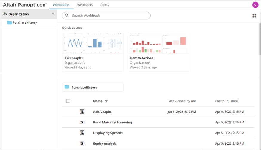 On either display view style, clicking on a workbook title or thumbnail displays the workbook on the Open Workbook in View Mode.
