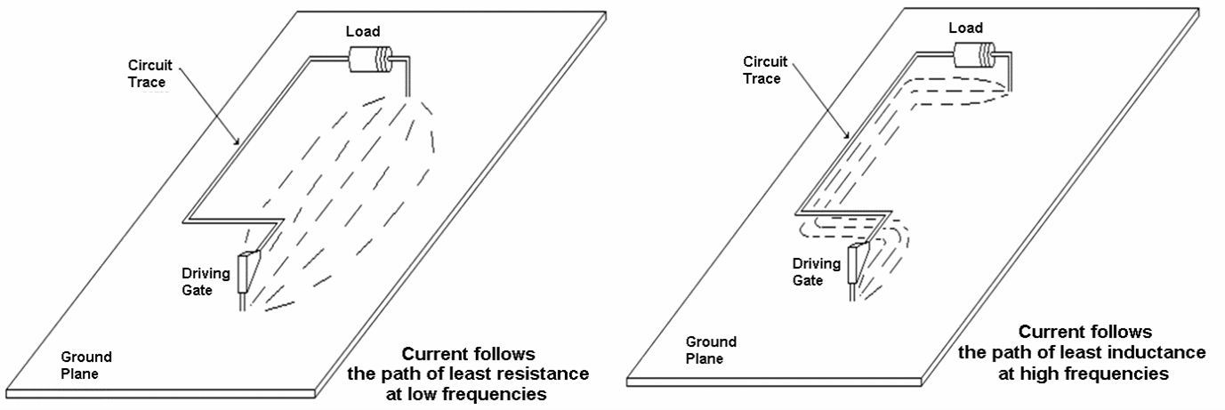 When a current flows on a signal trace, there is always a return loop. If some current goes out to somewhere, it will always come back to source. The path of returning current is Return Path. Return path is formed differently depends on frequency. At low frequencies, the current follows the path of least resistance. At high frequencies, current follows the path of least inductance and it stays tightly bunched near signal trace.