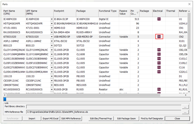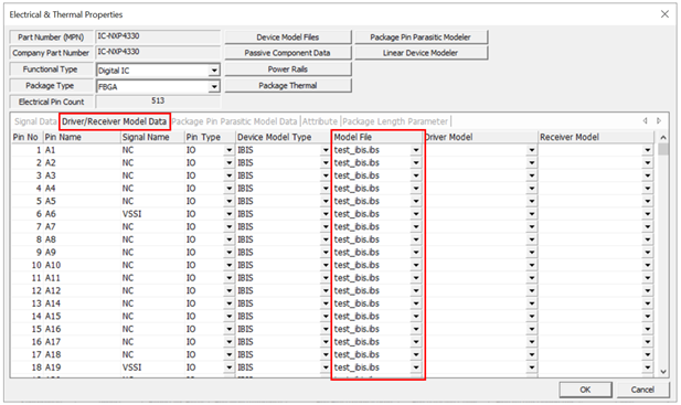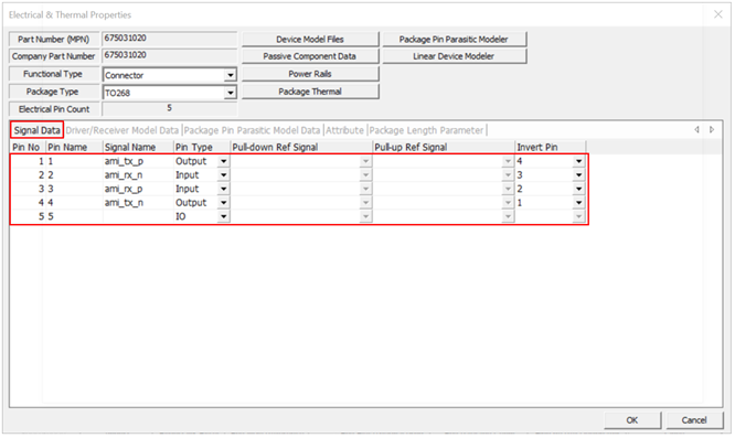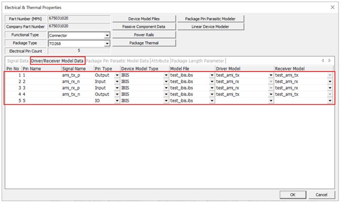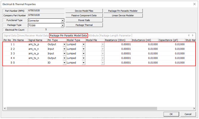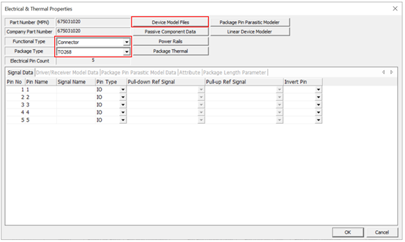 Figure 29.The Electrical & Thermal Properties dialog opens. The connector’s part properties are assigned automatically, as shown in the Electrical & Thermal Properties dialog.The Signal Data, Driver/Receiver Model Data, Package Pin Parasitic Model Data, and Attribute tabs provide detailed information.