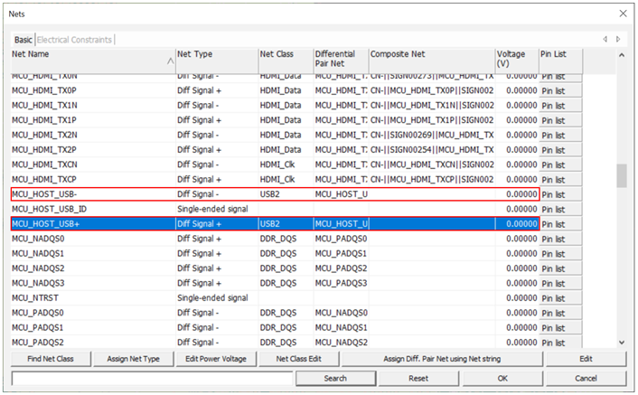 The MCU_HOST_USB+ and MCU_HOST_USB- nets are combined as a differential pair net.