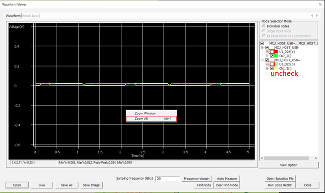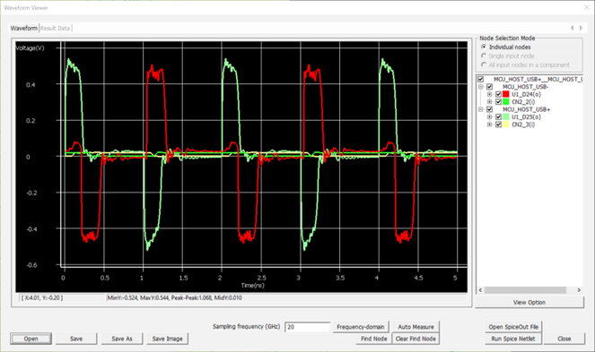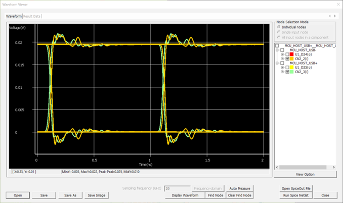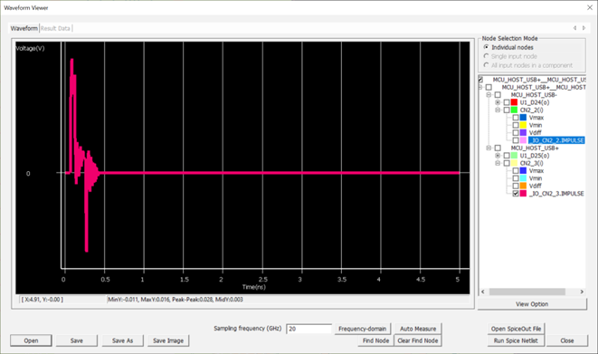 When the waveform analysis starts, electromagnetic simulation extracts the SPICE model for the selected net. The excitation source signal is applied to the net which is specified by the assigned pin model’s operating characteristics and the values defined at Input Signal and Pulse Period. When the simulation is done, the Waveform Viewer opens or exploring the waveforms.