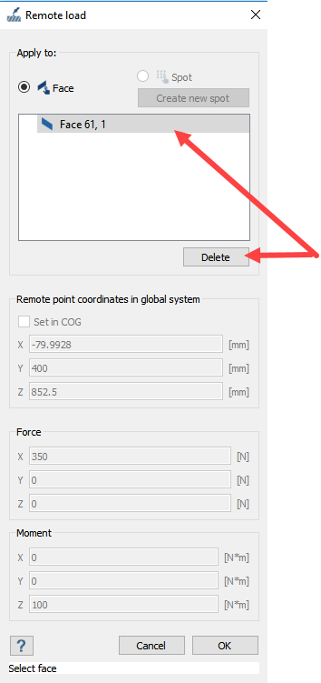 导入的远程载荷显示在对话框中,并映射在 模型视窗。你可以编辑表格中的远程坐标、力和力矩分量。您还可以根据需要编辑面映射。