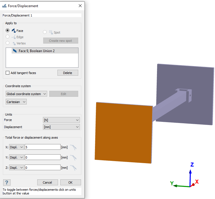 - 从每个方向的下拉菜单中,将载荷类型改为位移。