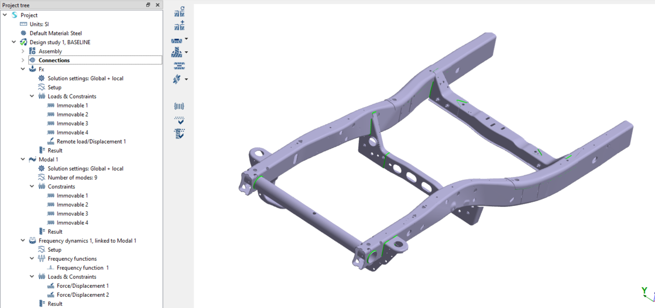 - 在项目树中,选择频率动力学 1,关联至模态 1 子工况。