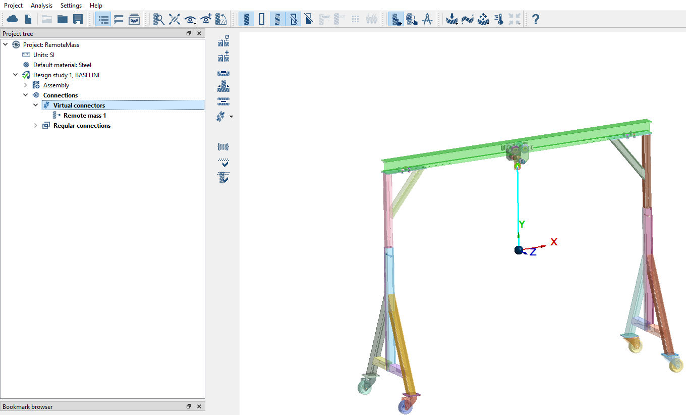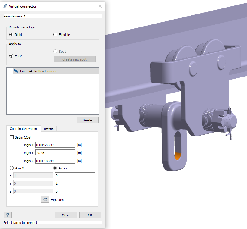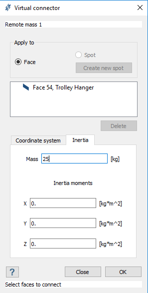 - 点击确定。远程质量列在项目树中的连接 > 虚拟连接器下。在模型视窗中显示为指定坐标处的点质量。