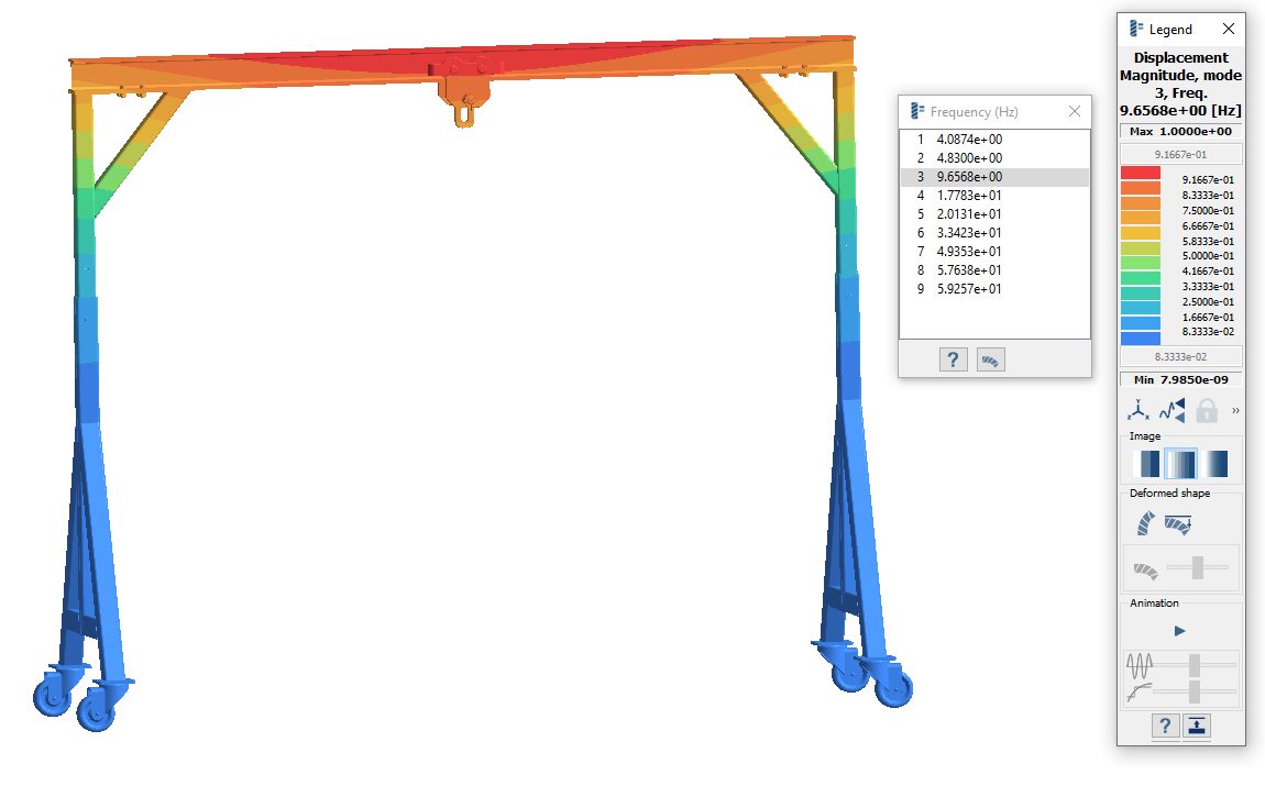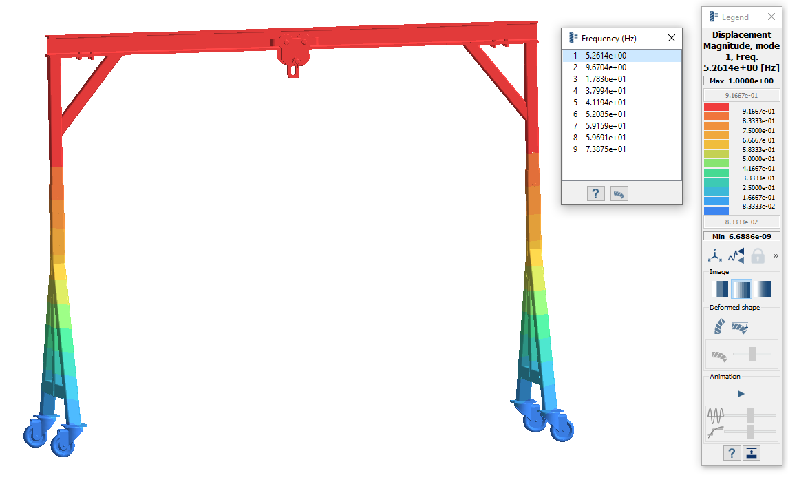 图例窗口会打开并显示云图。频率 (Hz) 窗口会打开,并显示各种模式。可以在频率之间切换以查看模态形状。