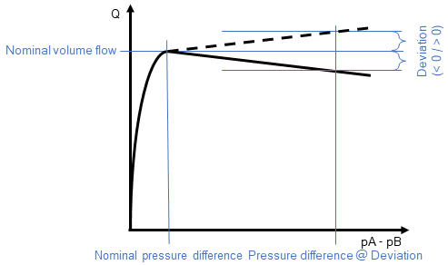 For all pressures exceeding Nominal pressure difference the valve keeps the flow constant with the given Deviation at Pressure difference @ Deviation.