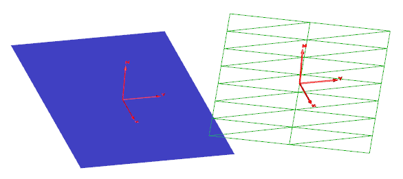 The green rectangle on the right is visualized in wireframe thus highlighting the influenceof the discretization. Moreover, the u-axis of this rectangle is modifiedso that the rectangle is rotated about the z-axis of frame_a.