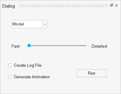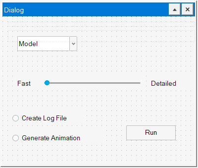 Save As Descrption *.ui Saves your design as a UI Designer file. Use this file format when you want to continue working on your design through UI Designer. *.oml Use this format to generate a code skeleton. Note: Once you save your design as code, you cannot load it back into the UI Designer. If you want to keep a working verision of your design that you can open through the UI Designer, save a version in .ui format before saving as code.When the design example from above is saved as an .oml file, the following code is produced:% Auto-generated code by UI Designer %----------------------------------- % Callback functions: %----------------------------------- function slider_callback(handle, callstate) % Add callback implementation: [slider] end function radioButton_callback(handle, callstate) % Add callback implementation: [radioButton] end function radioButton_2_callback(handle, callstate) % Add callback implementation: [radioButton_2] end function pushButton_callback(handle, callstate) % Add callback implementation: [pushButton] end function popupMenu_callback(handle, callstate) % Add callback implementation: [popupMenu] end %----------------------------------- % GUI elements: %----------------------------------- Dialog = figure('units', 'pixels', 'position', [0 0 410 310] ... , 'numbertitle','off', 'name','Dialog'); undock(Dialog); slider = uicontrol('parent', Dialog, 'style','slider' ... , 'callback','slider_callback', 'interruptible','off' ... , 'units','normalized', 'position',[0.25 0.50 0.21 0.07] ... , 'enable','on', 'max', 99 , 'min', 0 , 'orient','horizontal' ... , 'value', 0 , 'sliderstep', [1 10] ... , 'callbackdelay',0.000000, 'tag','slider', 'userdata',[], 'tooltipstring','', 'visible','on'); text = uicontrol('parent', Dialog, 'style','text' ... , 'units','normalized', 'position',[0.07 0.47 0.15 0.10] ... , 'fontname','MS Shell Dlg', 'fontangle','regular', 'fontweight','normal', 'fontsize',7.80 ... , 'enable','on', 'string','Fast' ... , 'horizontalalignment','left' ... , 'verticalalignment','middle', 'foregroundcolor', [20 20 20], 'backgroundcolor', [246 246 246] ... , 'tag','text', 'userdata',[], 'tooltipstring','', 'visible','on'); text_2 = uicontrol('parent', Dialog, 'style','text' ... , 'units','normalized', 'position',[0.47 0.47 0.15 0.10] ... , 'fontname','MS Shell Dlg', 'fontangle','regular', 'fontweight','normal', 'fontsize',7.80 ... , 'enable','on', 'string','Detailed' ... , 'horizontalalignment','left' ... , 'verticalalignment','middle', 'foregroundcolor', [20 20 20], 'backgroundcolor', [246 246 246] ... , 'tag','text_2', 'userdata',[], 'tooltipstring','', 'visible','on'); radioButton = uicontrol('parent', Dialog, 'style','radiobutton' ... , 'callback','radioButton_callback', 'interruptible','off' ... , 'units','normalized', 'position',[0.05 0.67 0.25 0.10] ... , 'fontname','MS Shell Dlg', 'fontangle','regular', 'fontweight','normal', 'fontsize',7.80 ... , 'enable','on', 'string','Create Log File', 'value', 0 , 'foregroundcolor', [20 20 20] ... , 'tag','radioButton', 'userdata',[], 'tooltipstring','', 'visible','on'); radioButton_2 = uicontrol('parent', Dialog, 'style','radiobutton' ... , 'callback','radioButton_2_callback', 'interruptible','off' ... , 'units','normalized', 'position',[0.05 0.77 0.38 0.10] ... , 'fontname','MS Shell Dlg', 'fontangle','regular', 'fontweight','normal', 'fontsize',7.80 ... , 'enable','on', 'string','Generate Animation', 'value', 0 , 'foregroundcolor', [20 20 20] ... , 'tag','radioButton_2', 'userdata',[], 'tooltipstring','', 'visible','on'); pushButton = uicontrol('parent', Dialog, 'style','pushbutton' ... , 'callback','pushButton_callback', 'interruptible','off' ... , 'units','normalized', 'position',[0.53 0.77 0.25 0.10] ... , 'fontname','MS Shell Dlg', 'fontangle','regular', 'fontweight','normal', 'fontsize',7.80 ... , 'enable','on', 'string','Run', 'value', 0 ... , 'foregroundcolor', [0 0 0] ... , 'backgroundimage','' ... , 'backgroundcolor',[246,246,246], 'tag','pushButton', 'userdata',[], 'tooltipstring','', 'visible','on'); popupMenu = uicontrol('parent', Dialog, 'style','popupmenu' ... , 'callback','popupMenu_callback', 'interruptible','off' ... , 'units','normalized', 'position',[0.03 0.17 0.25 0.10] ... , 'fontname','MS Shell Dlg', 'fontangle','regular', 'fontweight','normal', 'fontsize',7.80 ... , 'enable','on', 'value', 1 , 'string', {'Model' } ... , 'foregroundcolor', [20 20 20], 'backgroundcolor', [255 255 255] ... , 'tag','popupMenu', 'userdata',[], 'tooltipstring','', 'visible','on');
