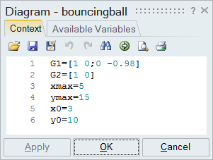 The Diagram Context tab contains an OML text editor for defining variables in a script for use in the definition of block parameters. All OML functions available in OML libraries are valid to enter into the script. All the variables that you define in the script are placed in the scope of the diagram and can be used to define block parameters in that diagram in addition to offspring diagrams and their contexts, as long as those variables are not redefined by another context.