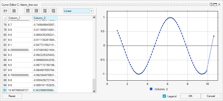 Option Description Load data from a .csv file. Save data to a .csv file. Insert a value before the first data point. Insert a value after the selected data point. Insert a value after the last data point. Delete the selected data points. Interpolation method drop-down list Select an interpolation method from the drop-down list to the right of the icons. Legend Select the check box to display the plot legend. Reset Select the Reset button to restore the default values for your curve.