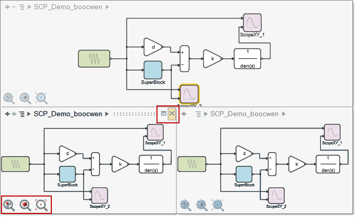 After splitting a window, you can select one of the new windows and navigate through the various levels of a model. You can also resize or float a window to view a particular diagram section.