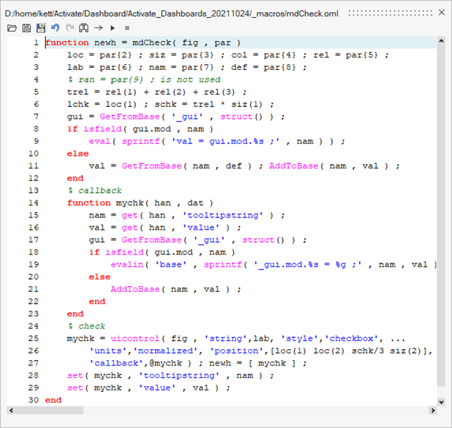 The editor is also used in model and diagram context, but unlike them, the code is not executed automatically. To execute the script, click the Run button.