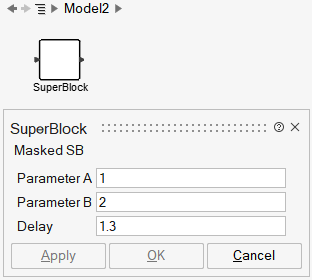 The mask parameter names are not directly visible on the mask GUI; they can be made visible by placing the cursor on top of the parameter description. In this case the mask parameters are named A, B and dT. The parameter values are defined by numerical values 1, 2 and 1.3. At this point the Super Block resembles a library block; the mask parameters are essentially local, private variables of the block, transparent to the user.