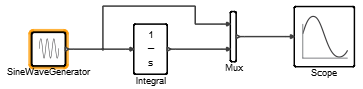 - Load the model SineIntegral_practice.scm that you created in the tutorial, Tutorial: Creating a Simple Block Diagram, or from the tree in the Demo Browser, select tutorial_models/SineIntegral.scm