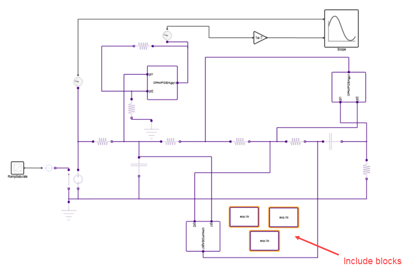 .subckt opampideal 2 1 3 G1 0 3 2 1 100000000 R3 3 0 1 C3 3 0 636e-6 .ENDSNote: In this tutorial example, the aop.lib file references the xinst block in your model through the.subckt(sub circuit) description. Alternatively, you can use the.modeldescription to reference the block. -