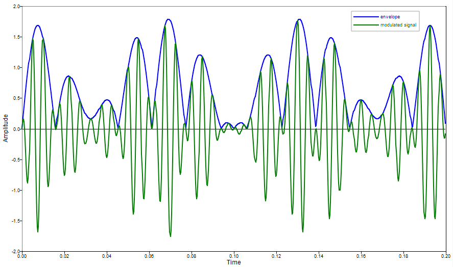 Envelope detection takes advantage of a 90 degree phase shift that occurs with the Hilbert transform. The shift causes the carrier frequency to drop out when taking the magnitude, leaving only the signal envelope.