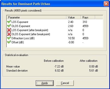 After a calibration has finished the results are displayed in a table. The picture below shows the results for the urban dominant path model. Depending on the propagation model different parameters are listed in the table.