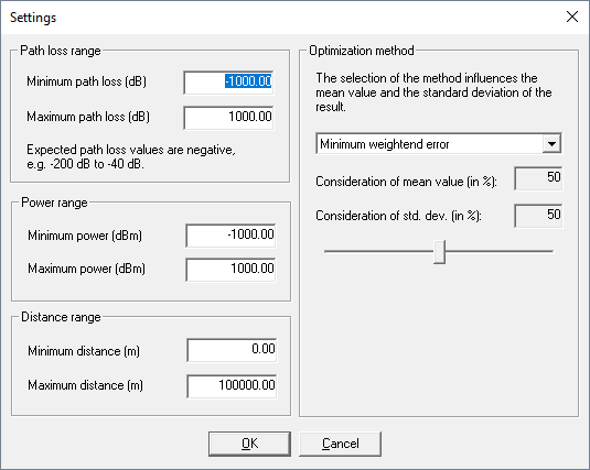 The settings can be adapted to the users needs by selecting General settings. This allows you to influence the selection of the measurement points. Only points in a given power (dBm), path loss (dB) or distance (m) range will be considered.