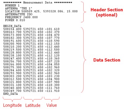 In the right part of the dialog the format of the data contained in the ASCII file can be specified. The data to be imported has to be in a tabular format with longitude / latitude coordinates and a corresponding measurement value. The columns to be imported can be specified within the Measurement Import dialog. In case the ASCII file contains a header section, keywords indicating the data section to be imported have to be entitled in the lower-right part of the Measurement Import dialog.