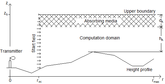 As the implementation of a transparent boundary condition at the top of the computation domain yielded too high computation times, an absorbing medium is used instead to avoid reflections at the upper boundary. Having a width of about wavelengths, the absorbing medium works well for all frequencies if an adequate distance to the highest terrain point is assumed.