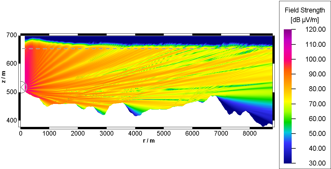 This so-called standard parabolic equation (SPE) leads to valid results if the propagation angle with respect to the horizon is in the range, –15° to 15°. Therefore the PE must not be used in the vicinity of the transmitter.